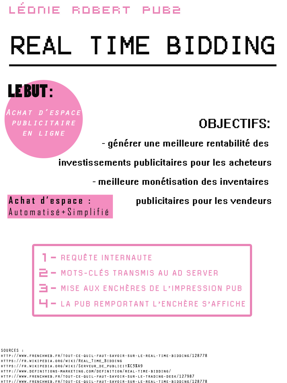 Le real time bidding est une technique d’achat publicitaires basée sur des enchères en temps réel entre les annonceurs et/ou les agences. Ces enchères proposent plusieurs critères, comme la taille de la bannière à acquérir, et surtout les indications relatives aux internautes, qui relèvent du lieu, du temps, de leurs centres d’intérêt. Cela permet aux annonceurs de n’être visibles que sur des supports qui se révèlent pertinents dans leur ciblage d’individus.Le RTB est un processus ne prenant que quelques millièmes de secondes à se mettre en place, notamment grâce à un trading desk qui n’est rien d’autre qu’une plateforme d’achat d’espaces publicitaires en ligne en temps réel. Les annonceurs peuvent donc acheter au coup par coup leur espace publicitaire, qui s’adapte beaucoup mieux à la cible. En effet, lorsque quelqu’un navigue sur le web, il laisse plein de données le concernant, ses habitudes, ses centres d’intérêt, qui sont récupérées, c’est la data, et cela permet entre autres aux publicités de se rapprocher efficacement de leurs potentiels clients.