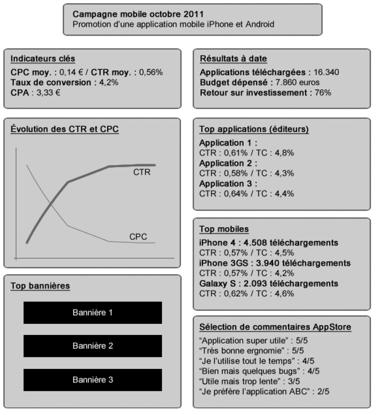 Figure 19.1: Voici un exemple de rapport pour une campagne mobile dont l’objectif est le téléchargement d’une application. En un coup d’œil, le lecteur peut se faire une idée de la performance de la campagne.